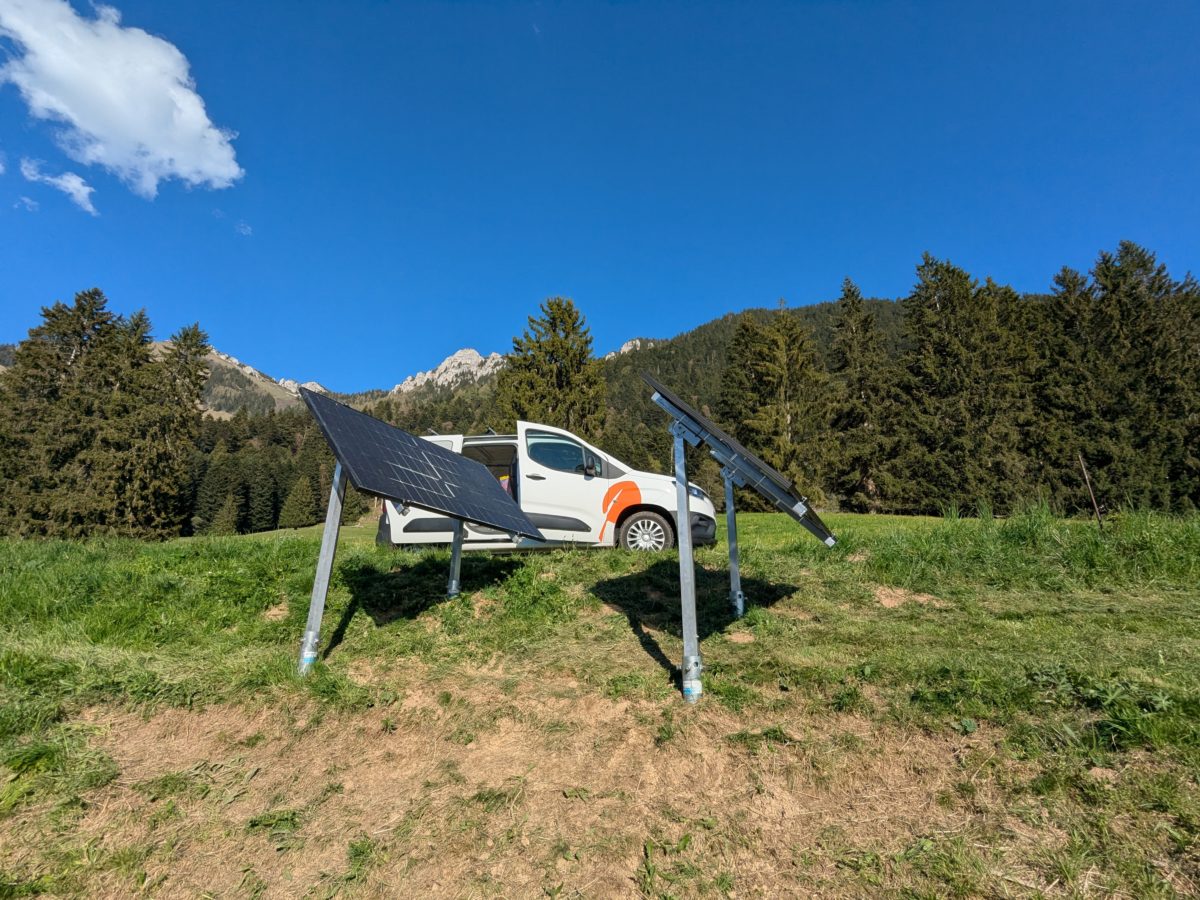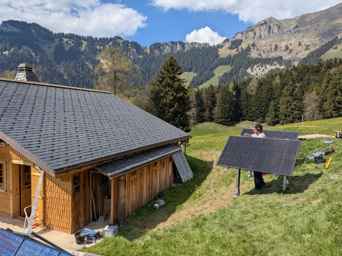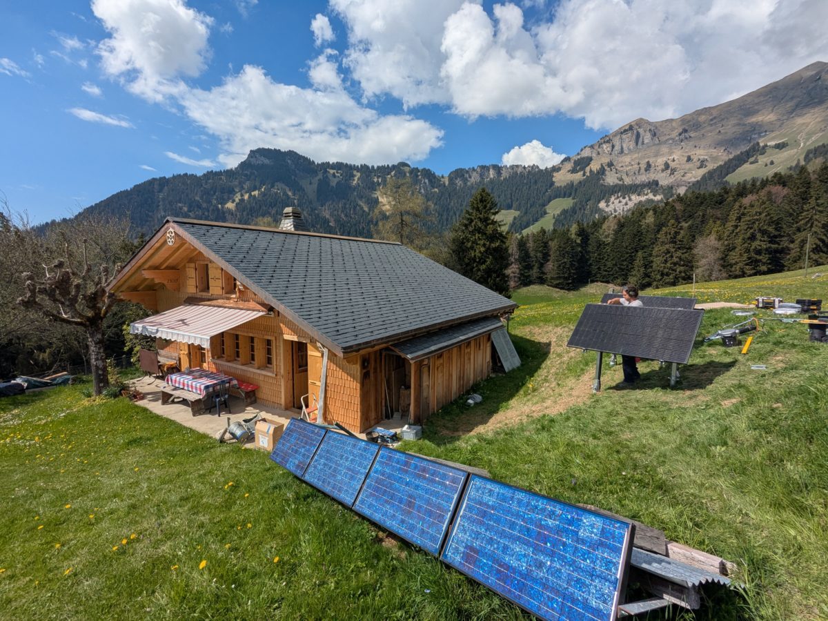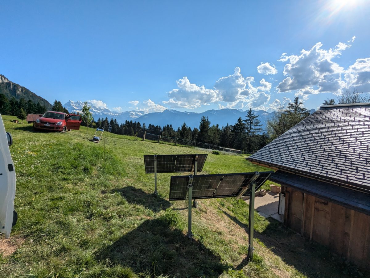 Luan (Corbeyrier) 2025 – Remplacement de vieux panneaux photovoltaïques sur une installation hors-réseau. Montage de deux nouveaux panneaux Soluxtec Alpin 350W sur supports et vis Krinner. Remplacement du régulateur solaire PWM par un régulateur MPPT.
